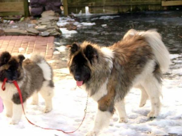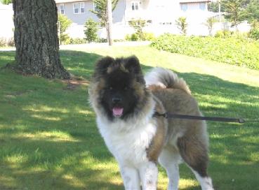 | Below meet "Hunter", loved by Scott & Elaine Hale, from CA. Pictured at 4 & 8 months & below..... Akita's are like Potato Chips no one can stop at just one LOL Hunter is pictured as a young adult with his lovely new best friend Jade a standard coated akita. |